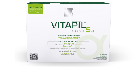 Vitapil® Clinic 5α to innowacyjny suplement diety stworzony z myślą o osobach doświadczających wzmożonego wypadania włosów na tle hormonalnym. Zawiera starannie wyselekcjonowane składniki, które wspierają zdrowie włosów od wewnątrz.